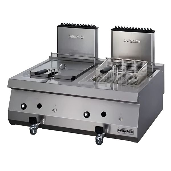 Bếp chiên nhúng đôi dùng gas Ozti OFGI 8070 công suất 20kW. Nhập khẩu Thổ Nhĩ Kỳ, dung tích 2x12L, nhiệt độ 110-190°C hằng ngày.